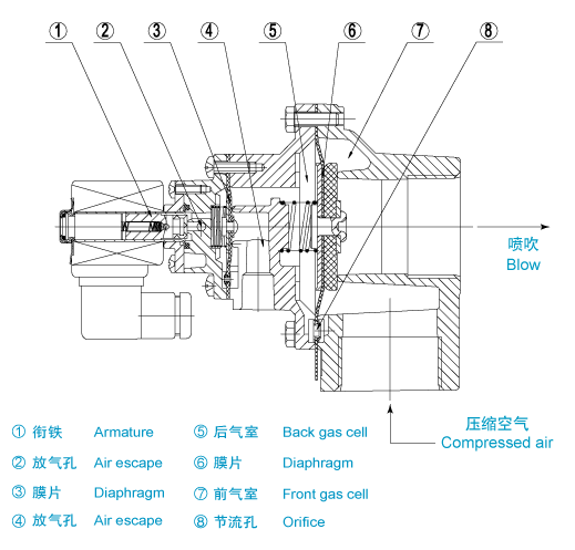 膜片把電磁脈沖閥分成前、后二個氣室,當接通壓縮空氣時,壓縮空氣通過節流孔進入后氣室,此時后氣室壓力將膜片組件緊貼閥的輸出口,電磁脈沖閥處于“關閉”狀態。